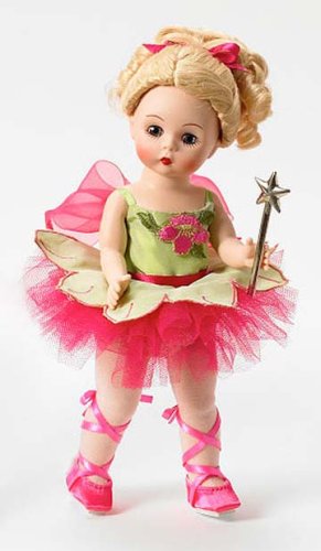 Tinker Bell is an 8-inch Wendy doll that is fully articulated. She has blonde hair and blue eyes. This Wendy wears a green and pink ballerina dress that resembles a flower. She has a pink hair bow and pink ballerina shoes. Wand is included. Released in 2009, Tinker Bell is a part of the Storyland collection and is recommended for ages 14 and up. This Madame Alexander doll carries on the tradition of The Alexander Doll Company, which has been known for its elegant and beautifully costumed dolls for over 80 years.