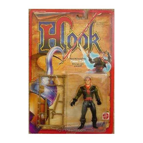 Hook Peter Pan (Swashbuckling) NIP Action Figure from the 1991 toy series. (Swings his sword) Hook’s crew stared with disbelief at the shadow high on the main sail. It was Peter Pan. He had returned to fight Hook as he had promised. “It’s you or me, Hook!” crowed Peter from his lofty perch. Hook shook a steely stump at him, a reminder of his last battle with Peter Pan. Pirates ducked for cover as Peter Pan dived to the deck. When Peter landed, a sneering, snarling crowd of pirates stood between Hook and him. Peter boldly took them all on. With the practiced precision of a master swordsman, he flung pistols from their fists and swept their swords overboard. “Hand over my children and I’ll let you live,” Peter called to Hook as he fought his way up the quarterdeck steps in the greatest war ever in Neverland.